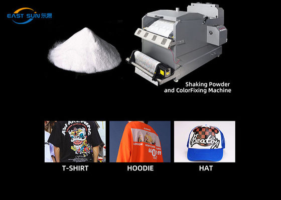 Das TPU-DTF-Pulver wird gleichmäßig über das gedruckte Muster auf dem Transferfilm gestreut, um eine vollständige Abdeckung des Designbereichs zu gewährleisten.